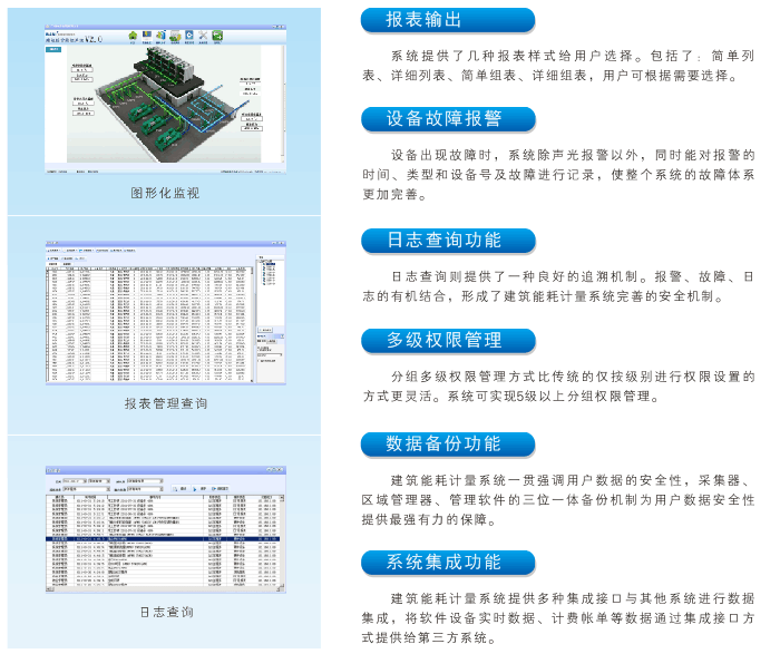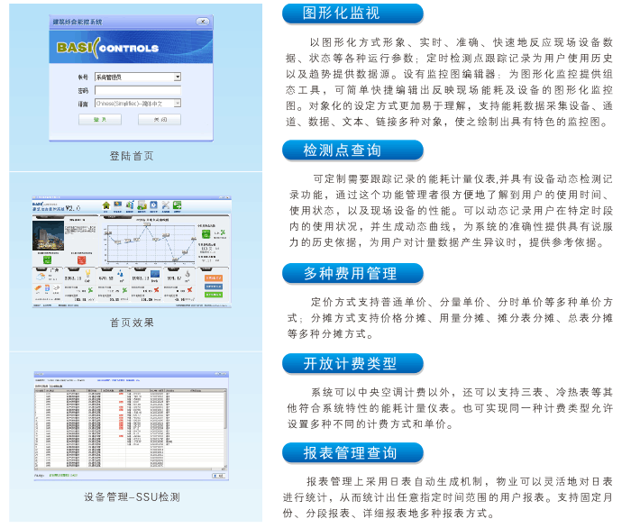 建筑綜合能控系統(tǒng)BEMCS2.0是基于Windows平臺(tái)的建筑綜合能耗分析、綜合控制的管理系統(tǒng)。建筑綜合能控系統(tǒng)是一套以能源管理和節(jié)能決策為目的的節(jié)能管理系統(tǒng), 提供能耗設(shè)備監(jiān)控,對(duì)能耗相關(guān)設(shè)備運(yùn)行狀況、運(yùn)行能效等相關(guān)參數(shù)進(jìn)行收集、顯示、報(bào)警等。提供定性和定量分析了解能源消耗狀況和相關(guān)報(bào)表圖表,以便決策層根據(jù)能耗分析報(bào)告調(diào)整運(yùn)營策略。對(duì)采集的數(shù)據(jù)進(jìn)行分析,實(shí)施能耗的優(yōu)化管理,合理調(diào)度使用能源,從而達(dá)到運(yùn)行節(jié)能的目的,實(shí)現(xiàn)能耗的優(yōu)化管理。