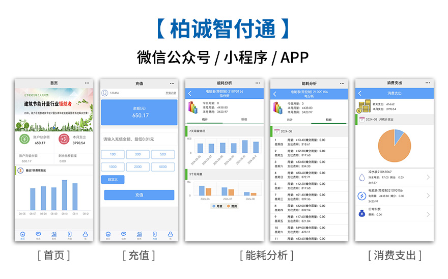 云能源管理系統(tǒng)配套的柏誠智付通,為物業(yè)管理和租戶提供手機端快捷操作。租戶通過APP/微信公眾號可對自己水、電、空調(diào)等用能情況進行實時查詢,查看賬戶余額、本月支出、用量消費詳情等,在線充值以及查詢充值記錄等功能,實現(xiàn)方便、快捷、高效管理。