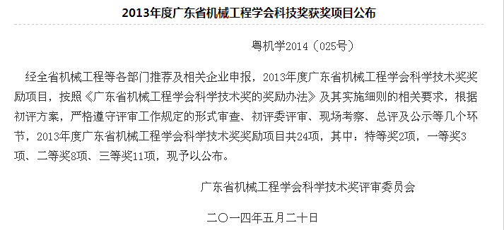 廣東省機(jī)械工程學(xué)會(huì)科學(xué)技術(shù)獎(jiǎng)是為獎(jiǎng)勵(lì)對(duì)我省科學(xué)技術(shù)進(jìn)步作出突出貢獻(xiàn)的公民和組織,調(diào)動(dòng)科學(xué)技術(shù)工作者的積極性和創(chuàng)造性,推動(dòng)科技進(jìn)步做出貢獻(xiàn)而設(shè)計(jì)。2013年度廣東省機(jī)械工程學(xué)會(huì)科學(xué)技術(shù)獎(jiǎng)共獎(jiǎng)勵(lì)特等獎(jiǎng)2項(xiàng),一等獎(jiǎng)3項(xiàng)、二等獎(jiǎng)8項(xiàng)、三等獎(jiǎng)11項(xiàng)。