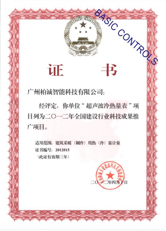 2012年4月10日作為柏誠智能我國南方唯一一家生產(chǎn)冷熱能表企業(yè)捷報(bào)喜傳,制造生產(chǎn)“UHM超聲波冷熱能表”經(jīng)過國家住建部組織專家評(píng)審、審核,今天正式獲得國家住建部《2012年全國建筑行業(yè)科技成果推廣項(xiàng)目證書》證書。
