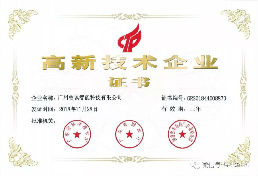 日前,柏誠繼2001年以來,再次榮獲由廣東省科學技術廳、廣東省財政廳、國家稅務總局廣東省稅務局頒發(fā)的“高新技術企業(yè)”證書,證書編號為GR201844008870。
