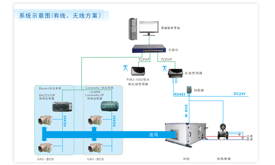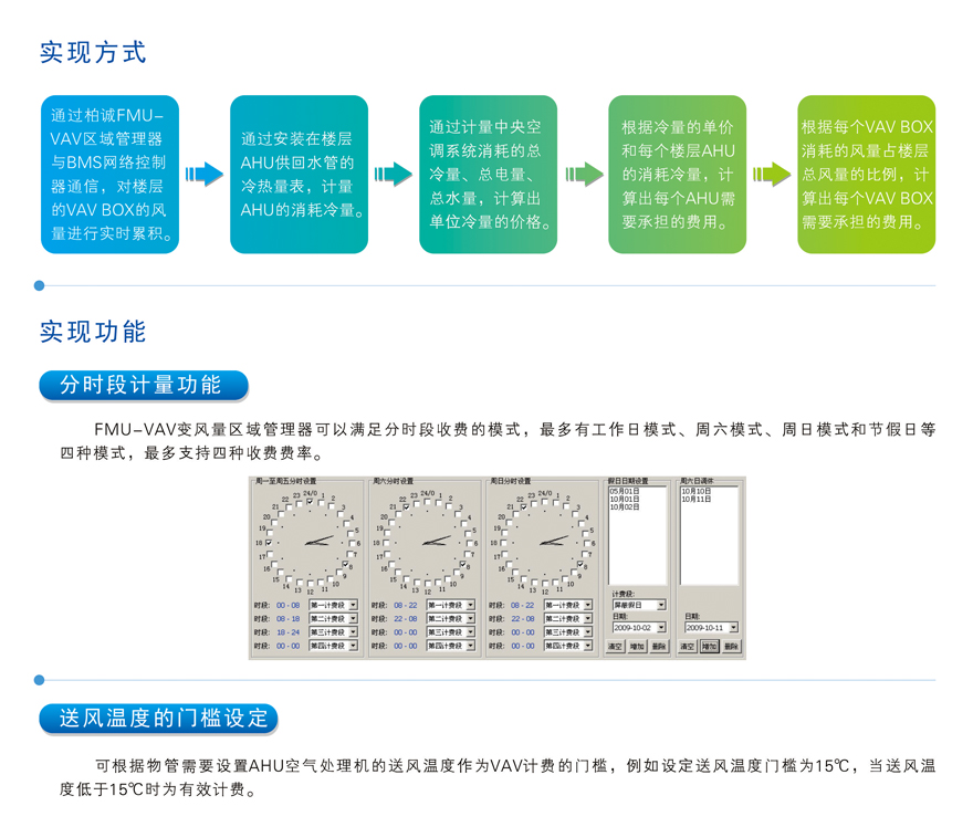 變風(fēng)量空調(diào)系統(tǒng)(VAV)是一種通過改變送風(fēng)量來調(diào)節(jié)室內(nèi)溫濕度的空調(diào)系統(tǒng),具有節(jié)能環(huán)保的優(yōu)勢,越來越得到市場廣泛的應(yīng)用。但由于VAV空調(diào)系統(tǒng)控制上的復(fù)雜程度較高,VAV BOX的數(shù)量眾多,要簡單高效地實(shí)現(xiàn)對VAV空調(diào)系統(tǒng)的用戶計(jì)量和收費(fèi),就必須解決計(jì)費(fèi)系統(tǒng)與BMS系統(tǒng)之間的數(shù)據(jù)交換。柏誠自主研發(fā)生產(chǎn)FMU-VAV變風(fēng)量區(qū)域管理器就是通過與BMS系統(tǒng)之間的數(shù)據(jù)交換,解決VAV空調(diào)計(jì)量的專業(yè)設(shè)備。FMU-VAV變風(fēng)量區(qū)域管理器可以將采集的VAV風(fēng)量數(shù)據(jù)與柏誠的BSH2000能源綜合管理系統(tǒng)集成在一套系統(tǒng)中進(jìn)行計(jì)費(fèi)和管理。
