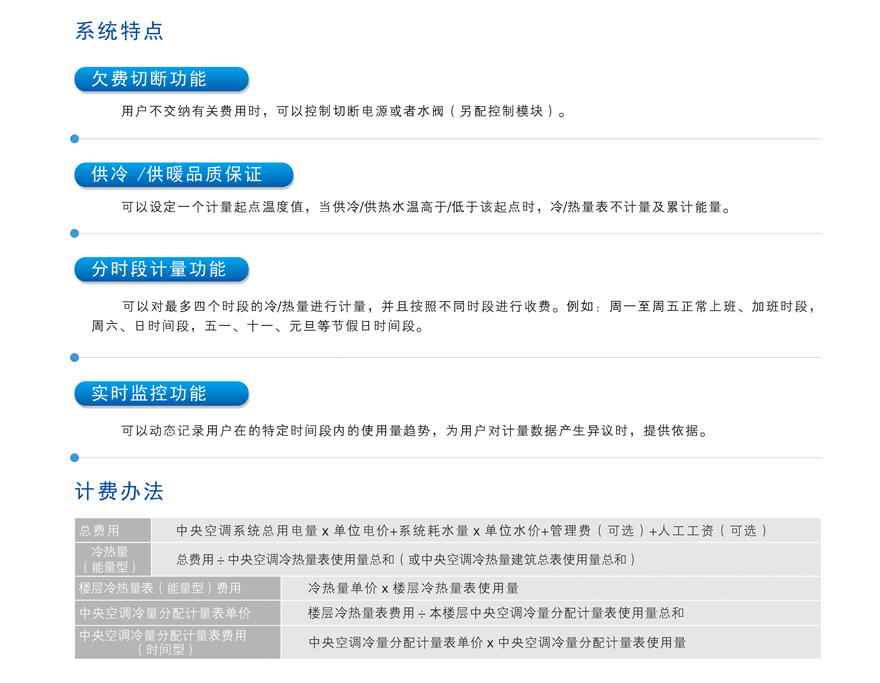 能量型與時間型相結(jié)合的計費方式進行中央空調(diào)費用的計量,是一種折中方案。即在每棟樓的每層樓層總管設(shè)置冷熱量表,計量冷熱量消耗,在每層的樓層總管下面的所有中央空調(diào)末端設(shè)備設(shè)置計量運行時間的裝置。